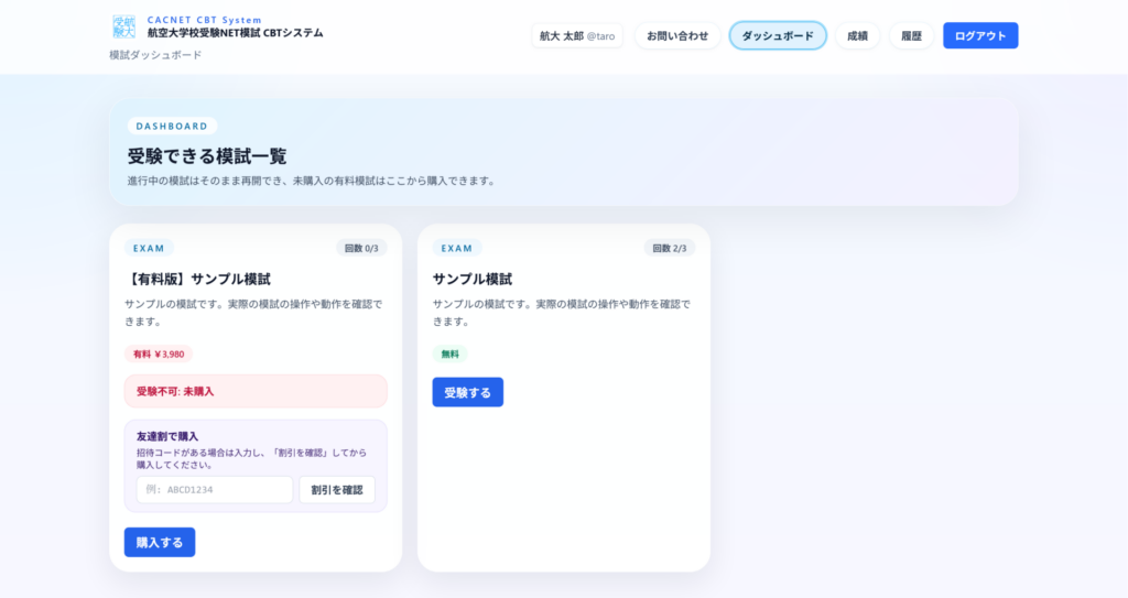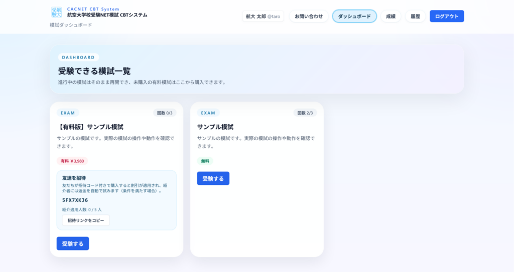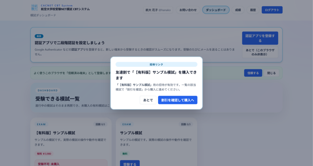 友達がその招待リンクからシステムにアクセスすると、紹介割引が自動で適用され、友達割価格で模試を購入できます。