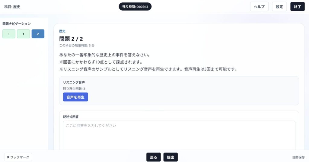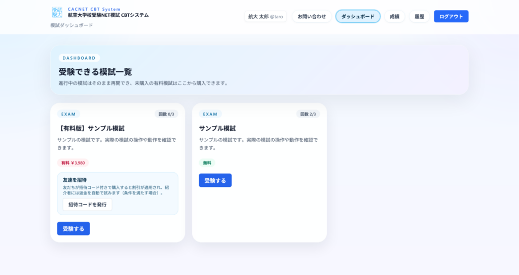 | キャンセル・返金 | <お客様都合のキャンセルについて> 決済完了後の返金はお受けしておりません。 <当サービス側の不具合による場合> 当サービス側の重大なシステム不具合により、受験が著しく困難となった場合は、状況確認のうえ、再受験のご案内または返金対応を行います。 なお、お客様側の通信環境、端末設定、ブラウザ設定等に起因する不具合については、返金対象外となる場合があります。 |
