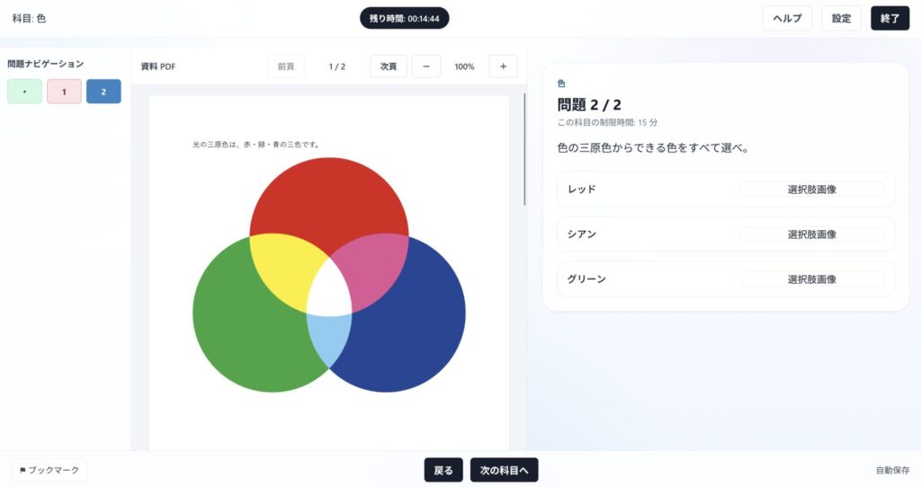 航空大学校受験NET模試 CBTシステムでは、プロメトリック社のCBT体験版をもとに、航空大学校のCBT試験方式をできる限り再現しています。